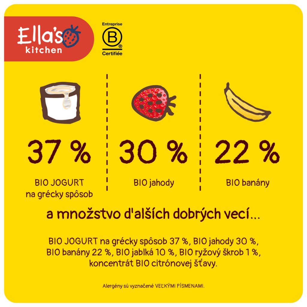 BIO JOGURT na grécky spôsob 37 %, BIO jahody 30 %, BIO banány 22 %, BIO jablká 10 %, BIO ryžový škrob 1 %, koncentrát BIO citrónovej šťavy.