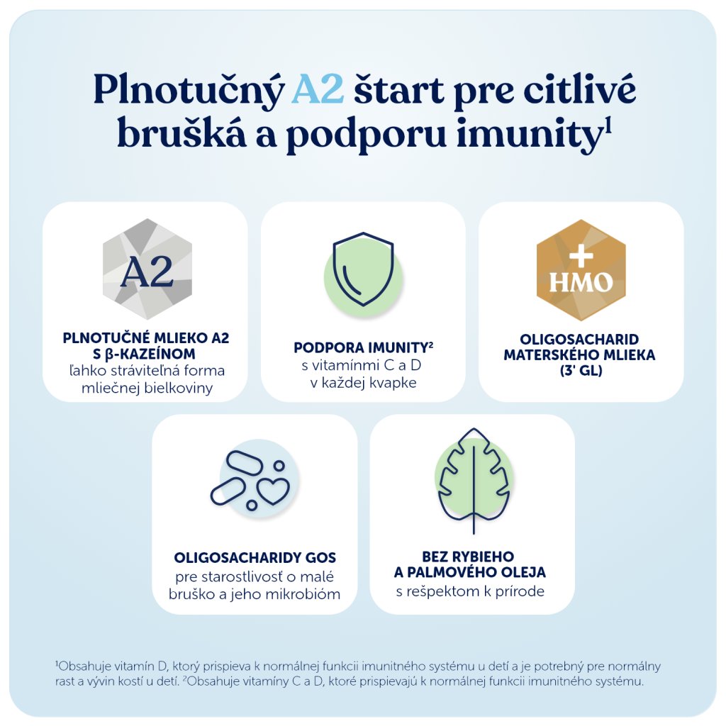 Dojčenie je najlepším spôsobom výživy vášho dieťaťa. Počiatočné kozie dojčenské mlieko 1 je určené na výživu dojčiat od narodenia, ak nemôžu byť dojčené, a malo by sa používať len na základe odporúčania lekára alebo osoby kvalifikovanej v oblasti výživy, farmácie alebo starostlivosti o matku a dieťa. Pri kŕmení z fľaše sa vyhnite zbytočnému predlžovaniu kontaktu cumlíka so zubami dieťaťa, čím sa zvyšuje riziko vzniku zubného kazu. Nezabudnite vyčistiť zuby dieťaťa po každom kŕmení pred spaním. Dôsledné dodržiavanie pokynov na prípravu a skladovanie je dôležité pre zdravie dojčiat.