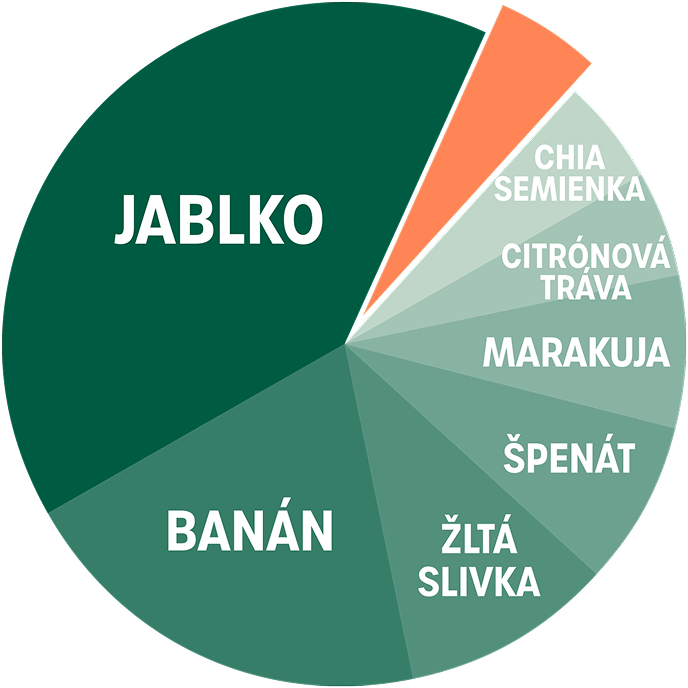 Zloženie: *jablkové pyré 40 %, *banánové pyré, voda, *pyré zo žltej slivky 10 %, *špenát 8 %, *šťava z marakuje, *chia semienka (Salvia hispanica) 0,7 %, *1zmes zelených potravín 0,27 % (spirulina, chlorella, mladý jačmeň, mladá pšenica), *citrónová tráva. *z ekologického poľnohospodárstva.