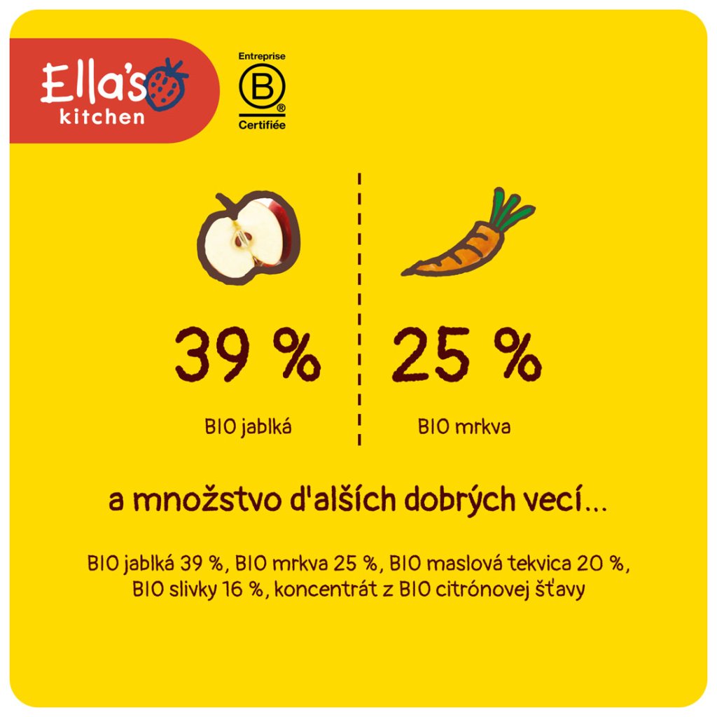 BIO jablká 39 %, BIO mrkva 25 %, BIO maslová tekvica 20 %, BIO slivky 16 %, koncentrát z BIO citrónovej šťavy