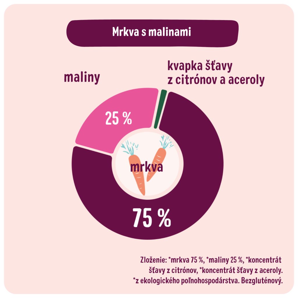 Zloženie: * mrkva 75 %, * maliny 25 %, * koncentrát šťavy z citrónov, * koncentrát šťavy z aceroly. *z ekologického poľnohospodárstva. Bez lepku.