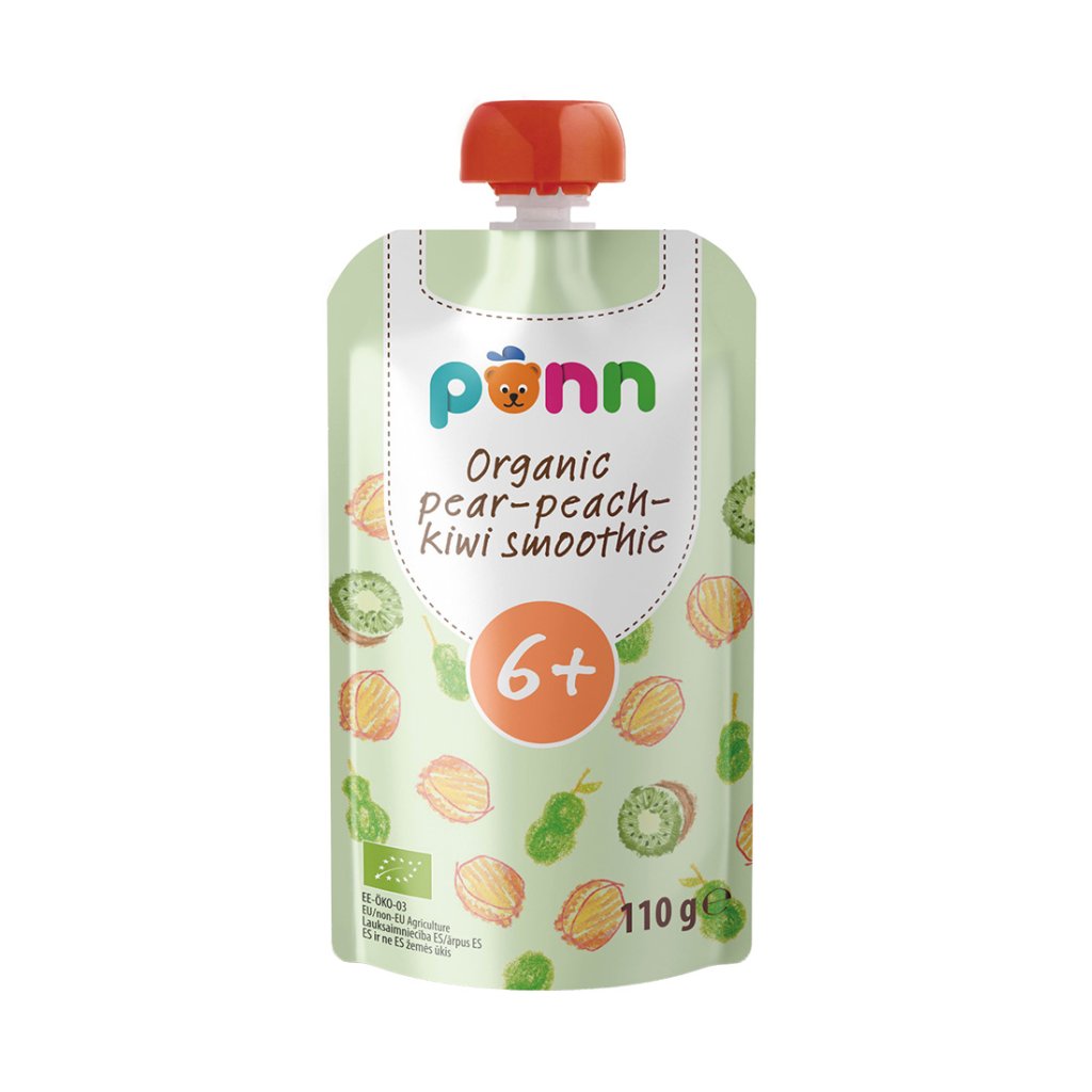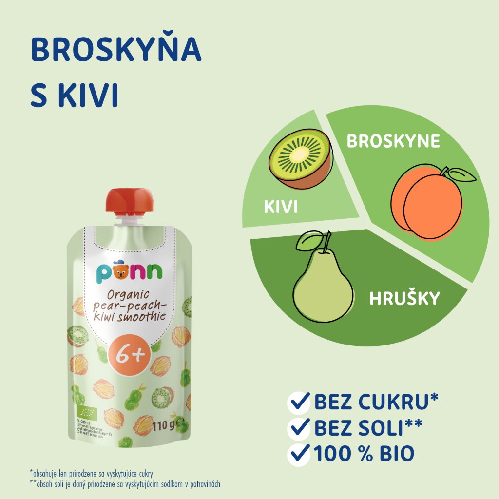 Zloženie: BIO hruškové pyré (55 %), BIO broskyňové pyré (35 %), BIO kivi pyré (10 %).