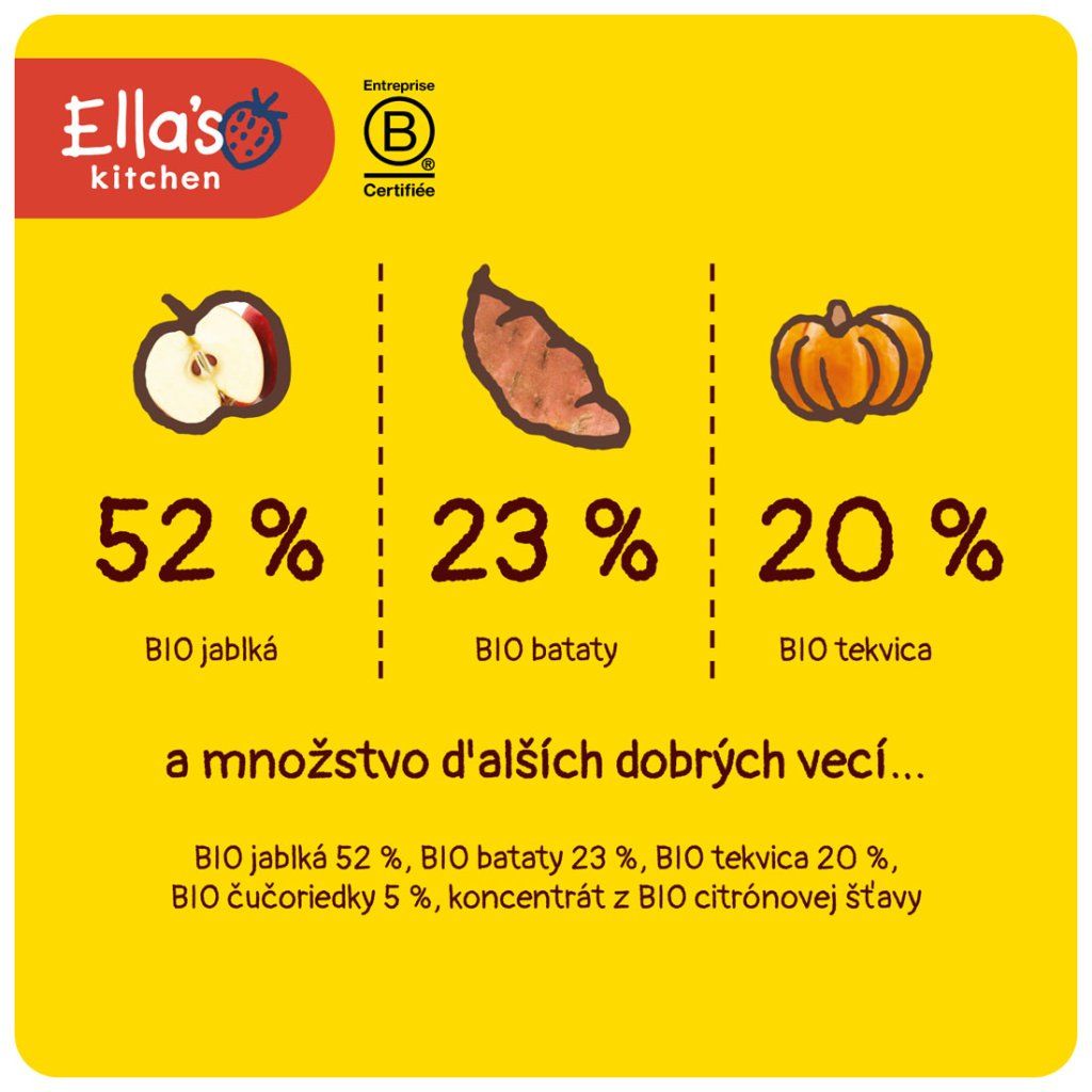 Výrobca: Ella’s Kitchen Ella’s Barn, 22 Greys Green Farm Rotherfield Greys Henley-on-Thames RG9 4QG, Veľká Británia. Oficiálny distribútor: Health Academy, s.r.o., Zbraslavská 22/49, 159 00, Praha, Česká republika.